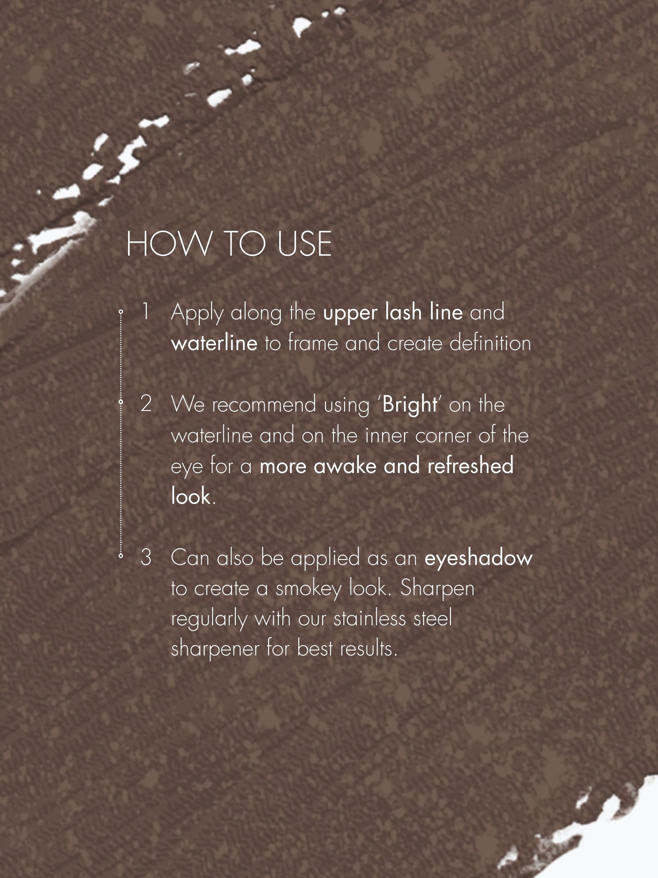 03 Can also be applied as an eyeshadow to create a smokey look. Sharpen regularly with our stainless steel sharpener for best results.