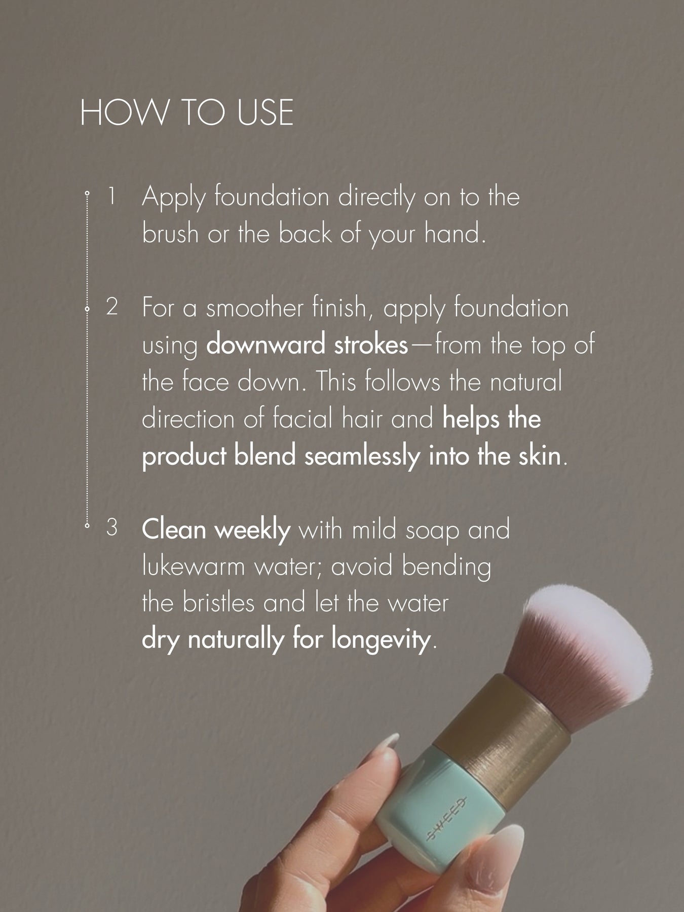 For a smoother finish, apply foundation using downward strokes—from the top of the face down. This follows the natural direction of facial hair and helps the product blend seamlessly into the skin.